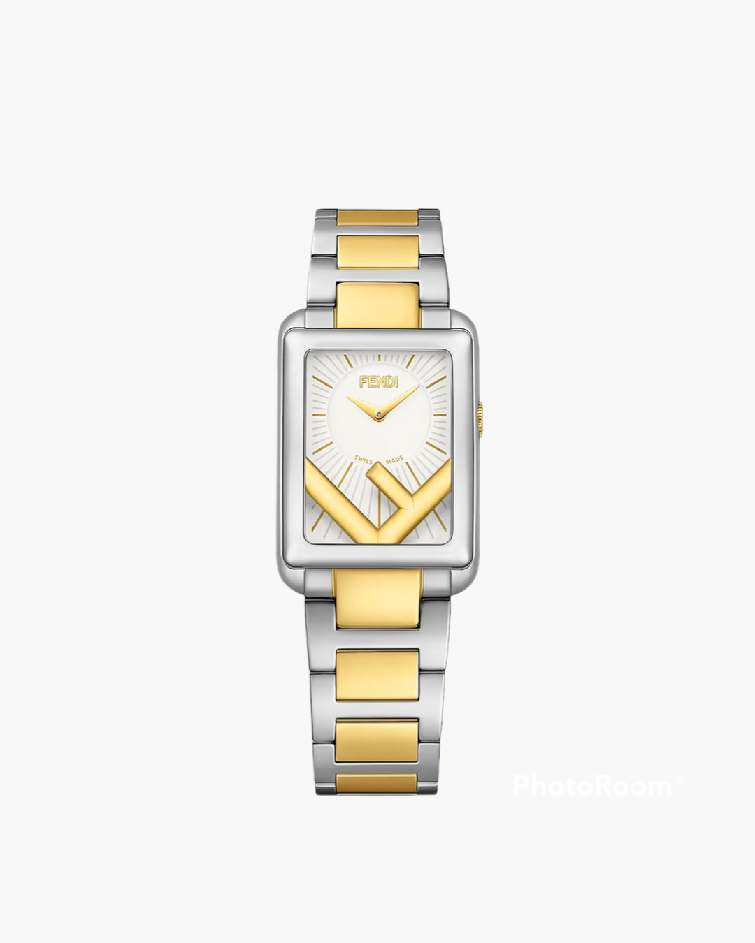 Boîtier en acier inoxydable poli, lettre F insérée et couronne en acier inoxydable couleur or jaune. Cadran décentré et courbé argent-blanc en opaline, minuterie grise, index et aiguilles couleur or jaune imprimé. Aiguilles dauphines couleur or jaune. Bracelet en acier inoxydable poli avec maillons centraux en acier inoxydable couleur or jaune, boucle déployante.