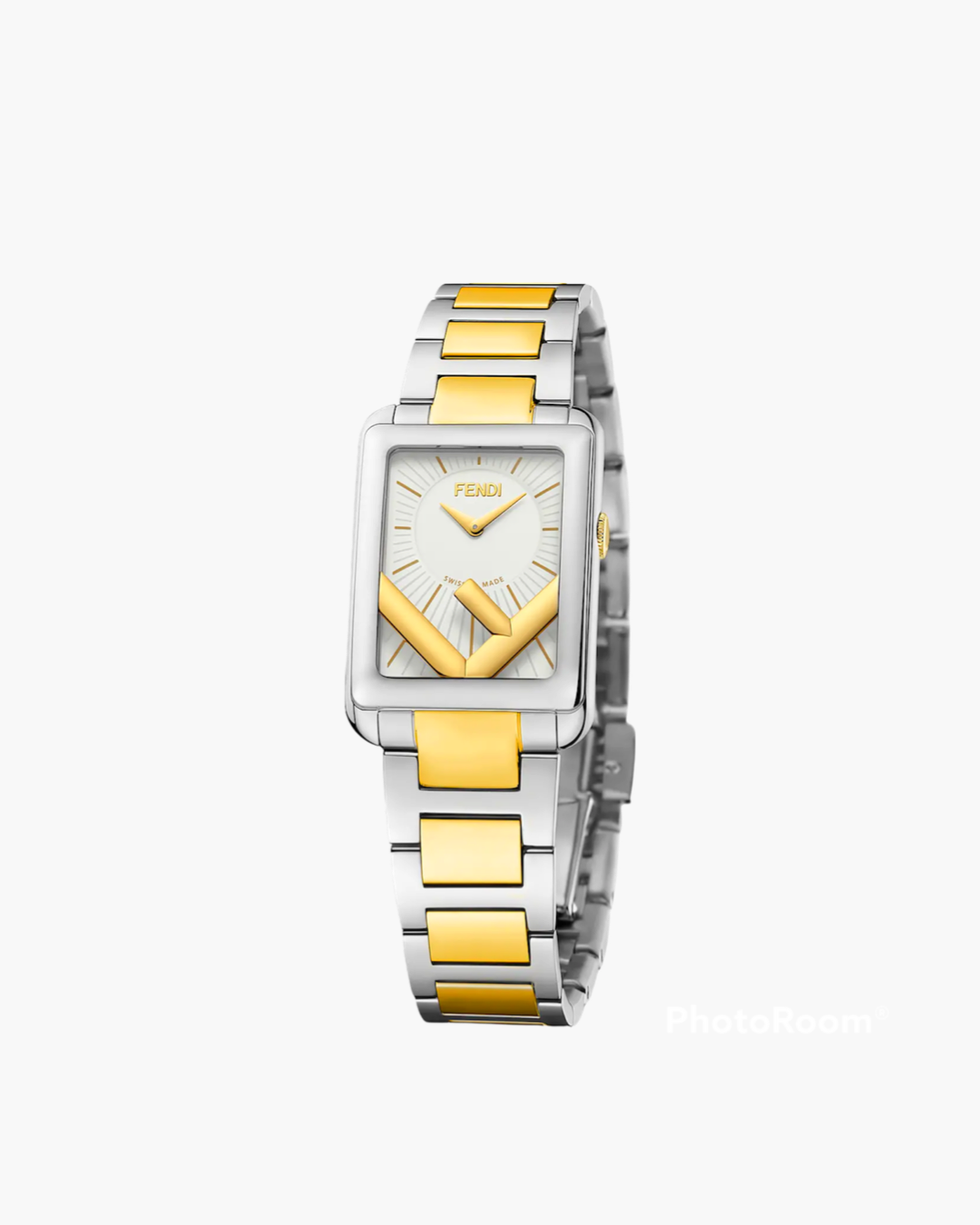 1100€Boîtier en acier inoxydable poli, lettre F insérée et couronne en acier inoxydable couleur or jaune. Cadran décentré et courbé argent-blanc en opaline, minuterie grise, index et aiguilles couleur or jaune imprimé. Aiguilles dauphines couleur or jaune. Bracelet en acier inoxydable poli avec maillons centraux en acier inoxydable couleur or jaune, boucle déployante.